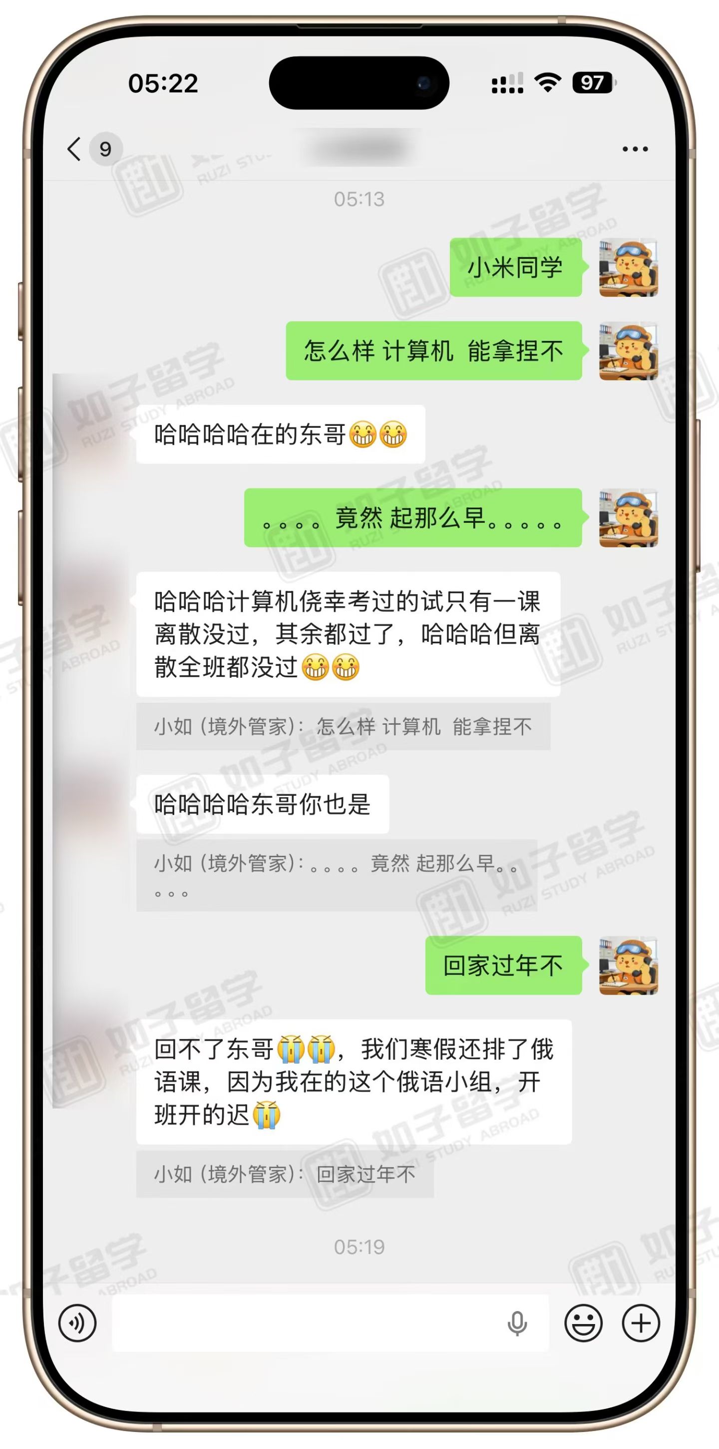 大家可以关注我们的微信公众号-如子留学,在我们这里,你会看到出国的孩子们每天发生的留学故事!能看到我们为孩子们做的,能获取更多的留学经验。